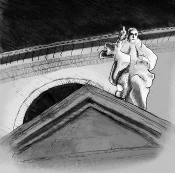 I Was rollerskating around El Pilar basilica When, from a strange point of view, I saw this sculpture Located like walking down a side of the fronton. When I aproach I saw it wasn't at all as dynamic as I Thought, the fronton Had two perfect Place in symetrically sculture classic harmony. What I imagined WAS too baroque for the building. So I Decided to draw What Was Not There.